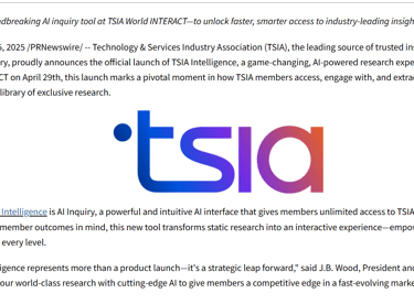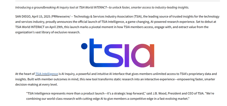 A press release announcing TSIA Intelligence, a new AI-powered tool built for technology and services leaders to access industry research and insights instantly.